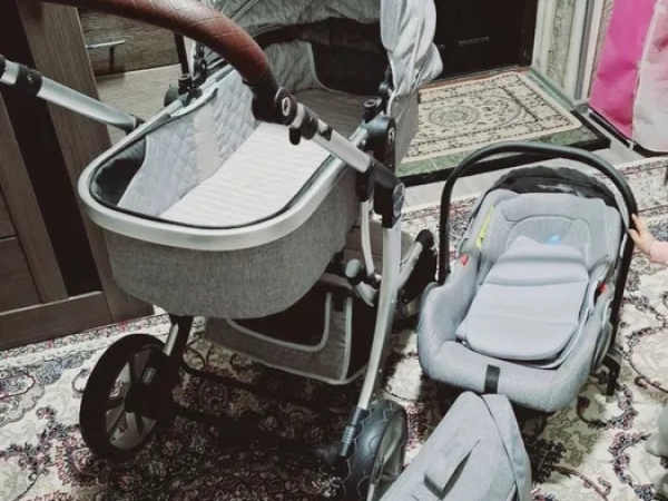 Qulay va zamonaviy 3-in-1 aravacha - beshik, o'rindiq va avtomobil o'rindig'i.