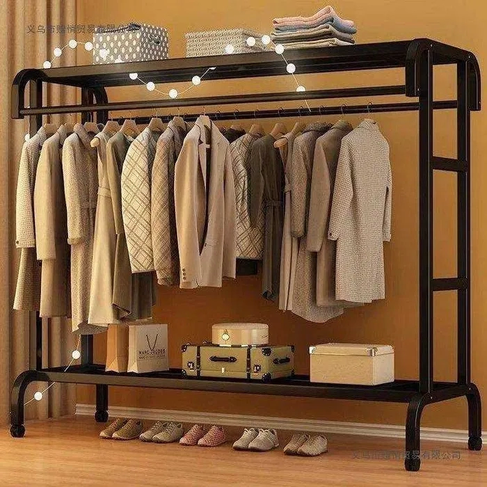 Стильная и надёжная двухуровневая напольная стойка для одежды идеально подойдёт для дома, гардеробной, магазина или шоурума. Усиленный металлический каркас обеспечивает устойчивость и долговечность, а продуманная конструкция позволяет удобно хранить одежду, обувь и коробки.